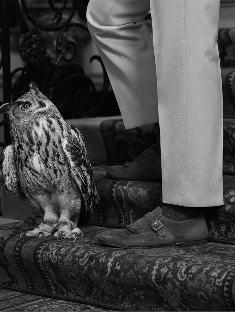 Le jour se lève sur le majestueux portique, où l'acteur britannique rédige son « Almanac of English Eccentricities » sur une machine à écrire, ses pieds chaussés de souples mocassins Rother qui complètent parfaitement un ensemble sur mesure. Une fois sa créativité assouvie, il descend un escalier imposant pour accompagner une paire de porcelets ventrus lors de leur promenade matinale tranquille, marchant avec aisance dans des chaussures à boucles Shanghai Laser.