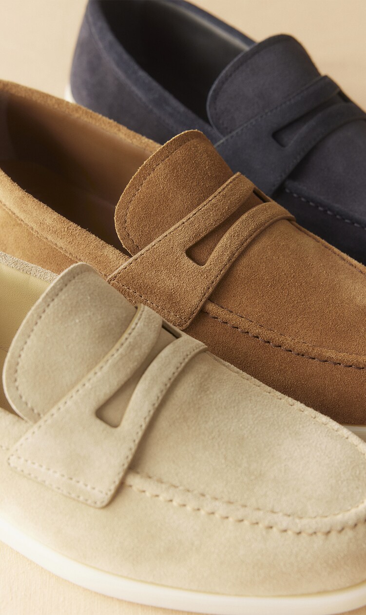 The rugged shores of the English coastland inspire a collection that celebrates leisure, blending dynamic energy with casual elegance. Timeless icons of effortless refinement, the Pembrey and Maesteg loafers sit alongside the innovative Portsmouth—a hybrid style that combines the comfort of sneakers with the classic style of a penny loafer.
